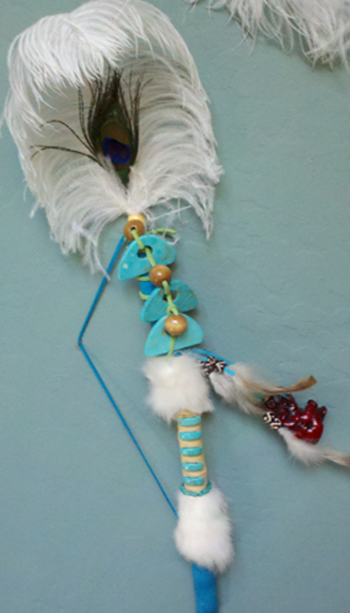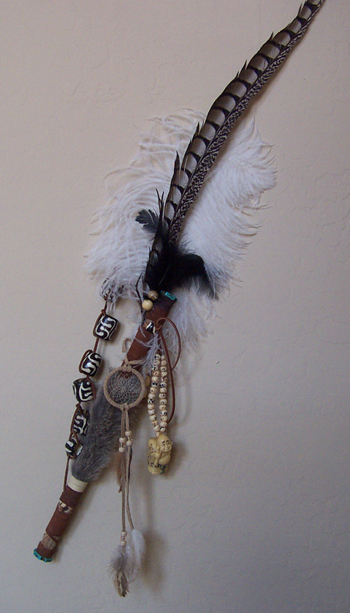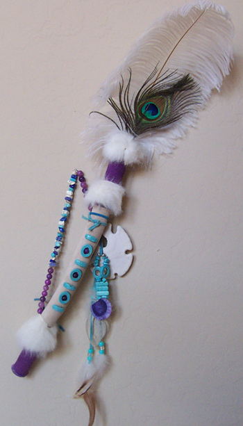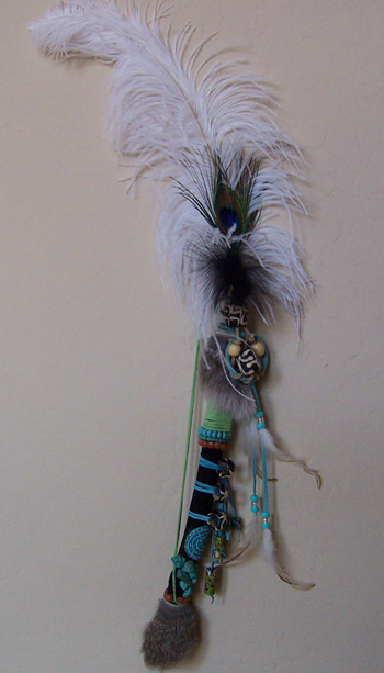 NOTE: My custom Talking Sticks, no two alike, are my interpretation of the authentic Talking Sticks made by the Native Americans. Prices will depend on the materials used. You may request your personal colors, beads, crystals, and embellishments. Prices may vary from $120 to $200. The Talking Stick will include birch wood, leather cording, leather strapping to wrap around the stick, a beaded strap to hang on the wall, if desired. It will include rabbit fur and feathers. All hanging ornaments will be priced, in addition, according to objects used. If you have any questions, you may call the designer at 602-882-2045.